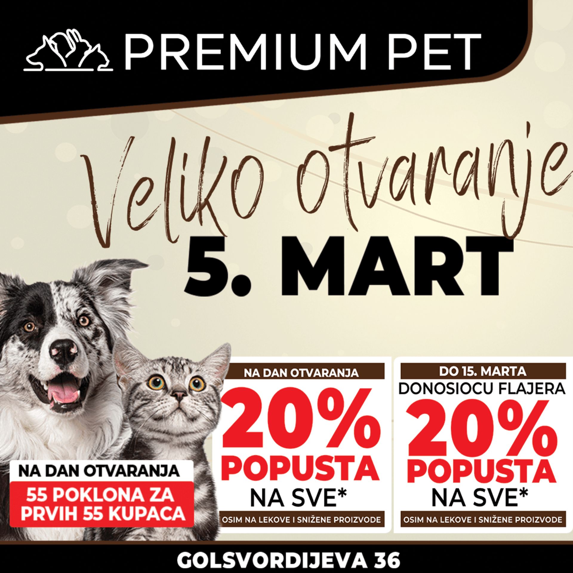 U četvrtak, 05. marta, Premium Pet otvara novu prodavnicu na adresi Golsvordijeva broj 36. Povodom otvaranja, prvih 55 kupaca očekuju pokloni, dok će tokom celog dana važiti 20% popusta na kompletan asortiman.