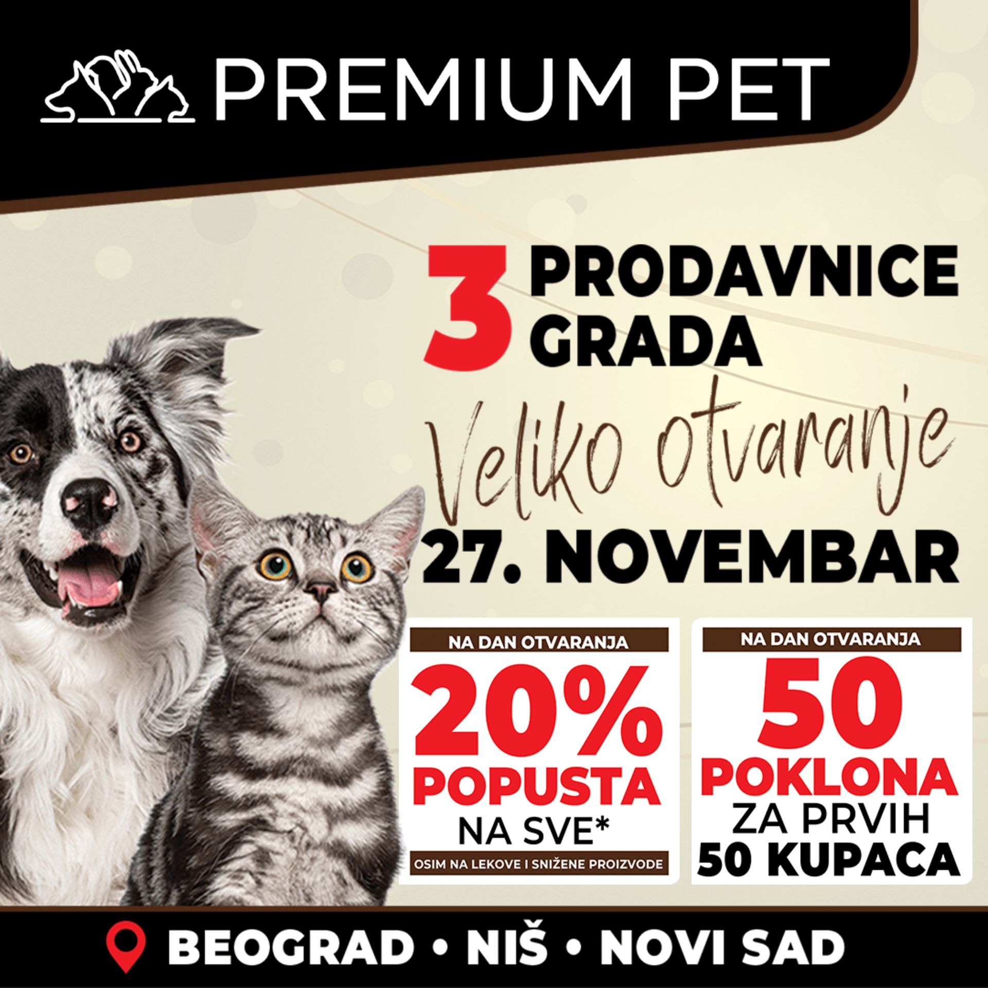 U četvrtak, 27. novembra, Premium Pet otvara vrata novih lokacija u Nišu, Novom Sadu i Beogradu, u samoj Čika Ljubinoj. Povodom otvaranja, prvih 50 kupaca u svakom gradu očekuju posebni pokloni, kao i 20% popusta na celokupan asortiman tokom celog dana.